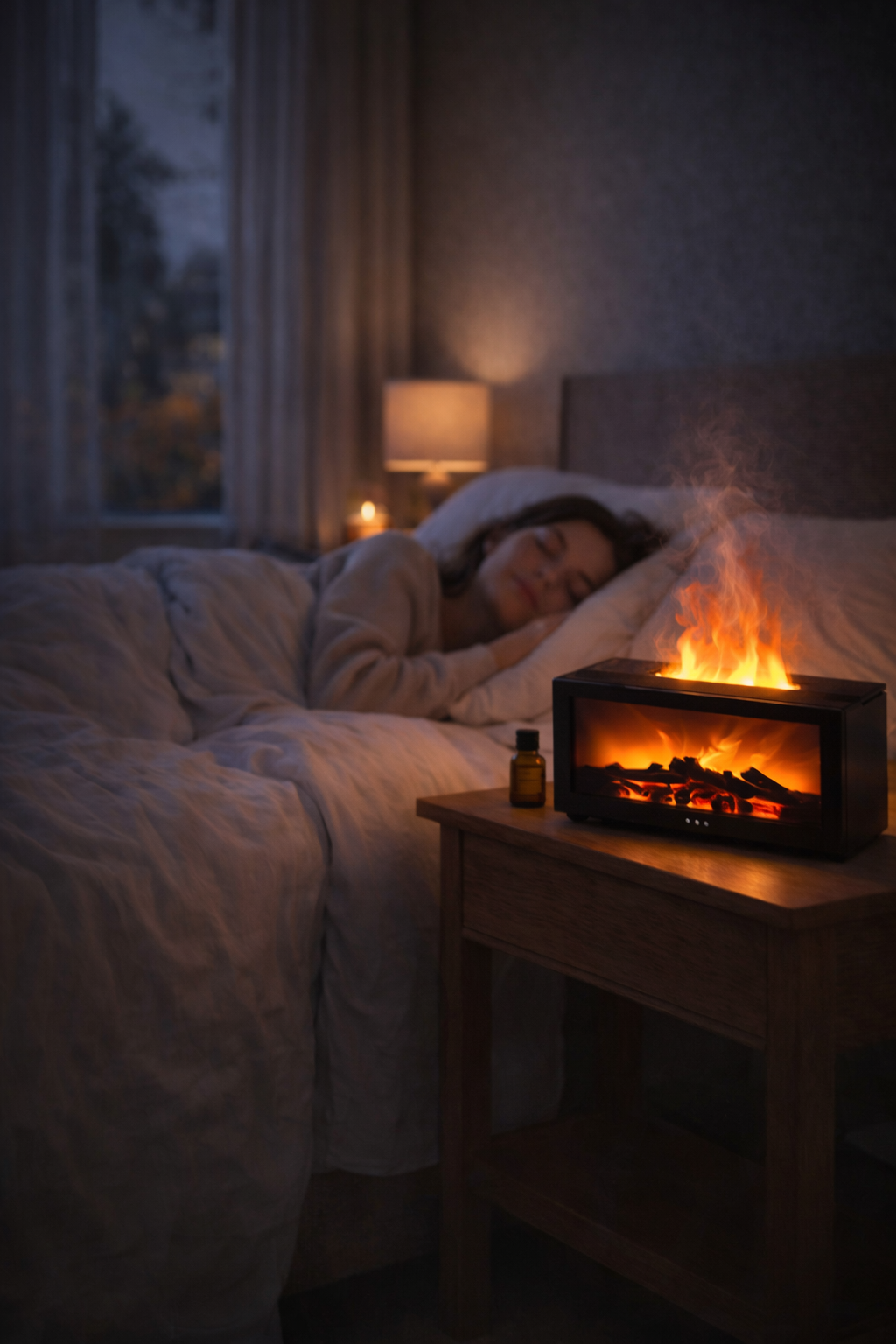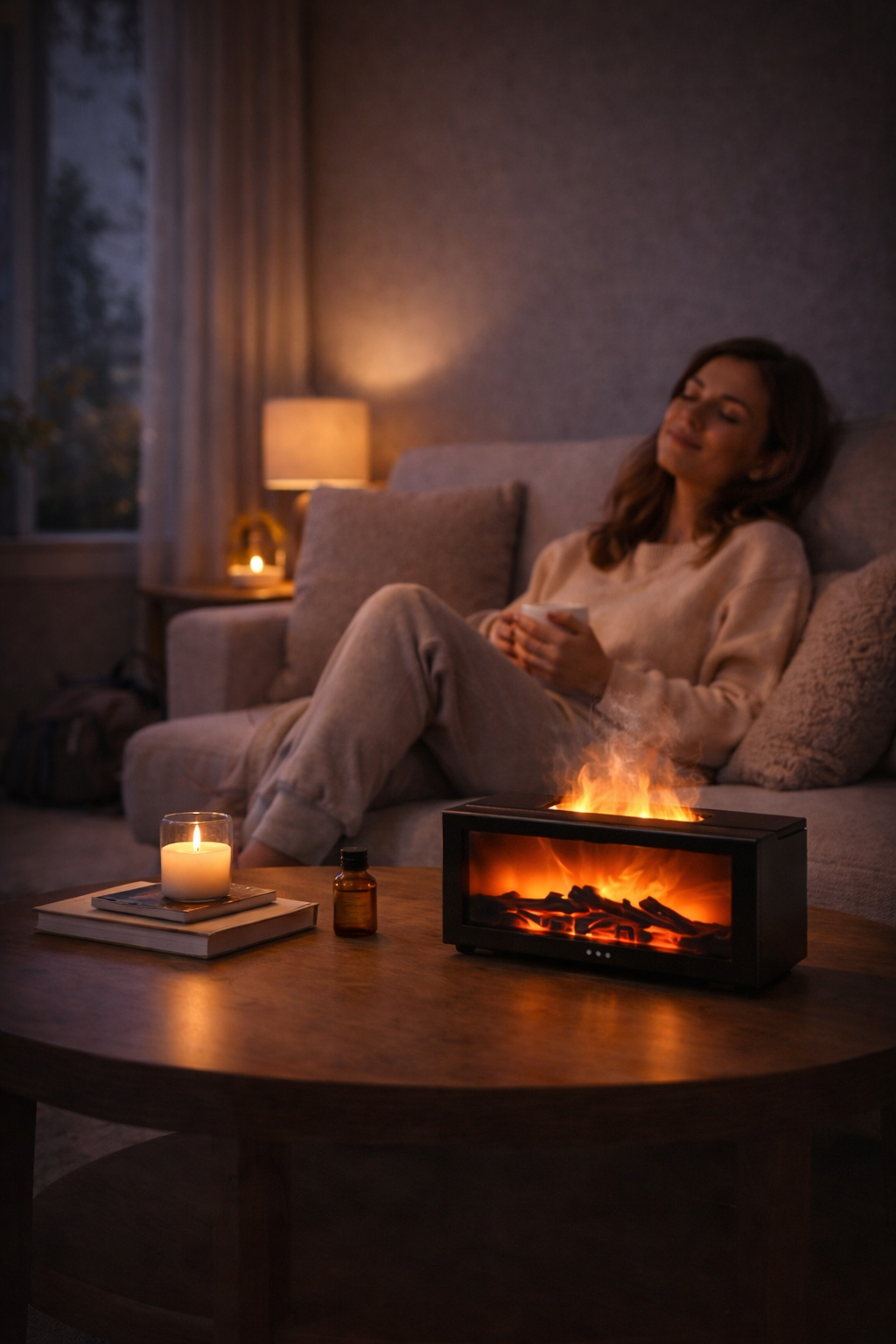 La lumière chaude effet flamme, la diffusion douce d’huiles essentielles et l’humidification légère créent un environnement que le cerveau associe au repos.